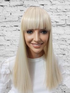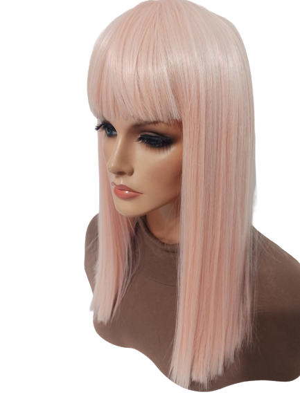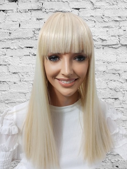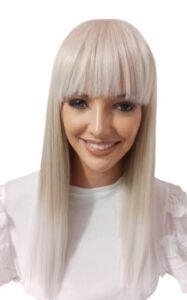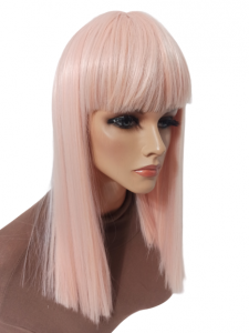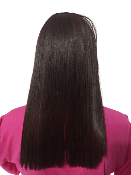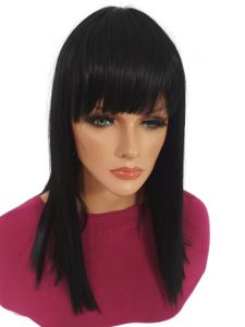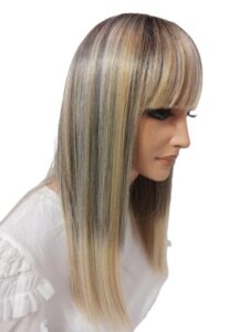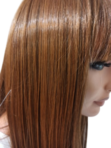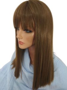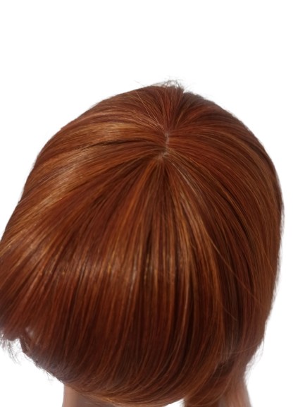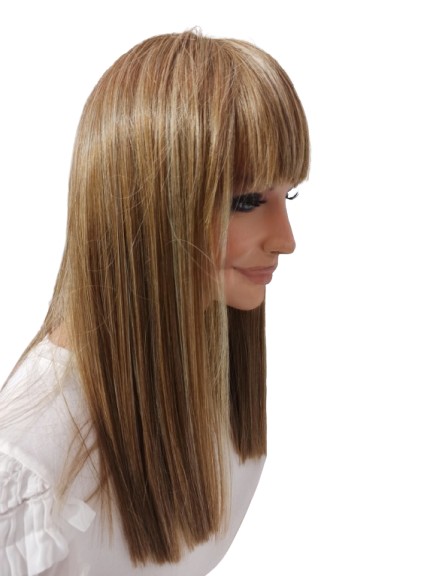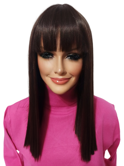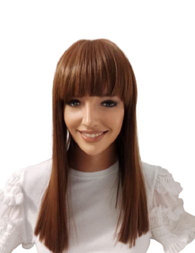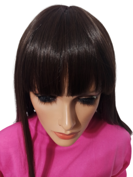 Peruka z włosów syntetycznych w kolorze ciemnego brązu 4 .Na środku stały przedziałek top-silk imitujący skórę głowy i wyrastające z niej pojedyńcze włoski.Włosy pozbawione szklistego połysku, odporne na temp.120 stopni-można suszyć suszarką.Peruka wykonana w całości na przewiewnej siatce.55-58,5cm.Długość fryzury-47cm