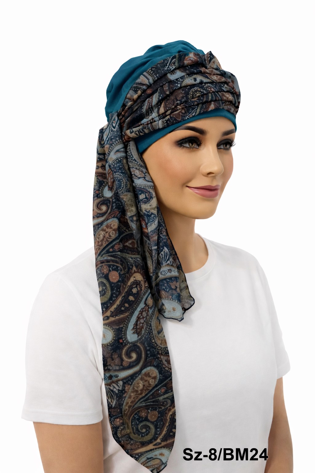 Gotowy do nałożenia turban w rozmiarze uniwersalnym . Posiada dekoracyjna szarfę o długości 70cm i szerokości 26 cm , która służy do obwiązania wokół głowy..Można ja wiązać na różne sposoby, z boku, z tyłu czy z przodu tworząc efekt zwiększonej objętości głowy.Czapka turbanu posiada z przodu i z tyłu marszczenia, dodające objętości.